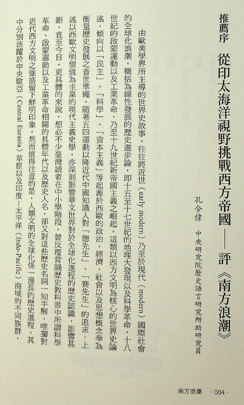 孔令偉,2022年,〈從印太海洋視野挑戰西方帝國——評《南方浪潮》〉推薦序,收入Sujit Sivasundaram 著、葉品岑譯,《南方浪潮》(臺北:時報出版社),頁4–9。
