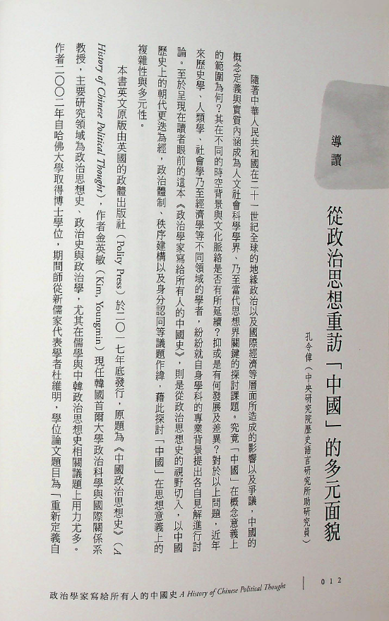 孔令偉,2023年12月,〈從政治思想重訪「中國」的多元面貌〉導讀,收入金英敏著,陳牧謙譯,《政治學家寫給所有人的中國史》(新北:臺灣商務印書館),頁12–15。