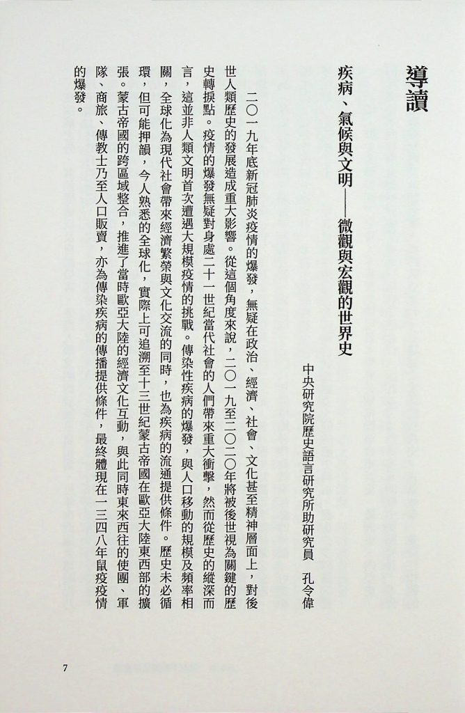 孔令偉,2024年,〈疾病、氣候與文明——微觀與宏觀的世界史〉導讀,收入長谷部史彥等著,陳嫻若譯,《歷史的轉換期5:1348年.氣候不順與生存危機》(新北:臺灣商務印書館),頁7–10。