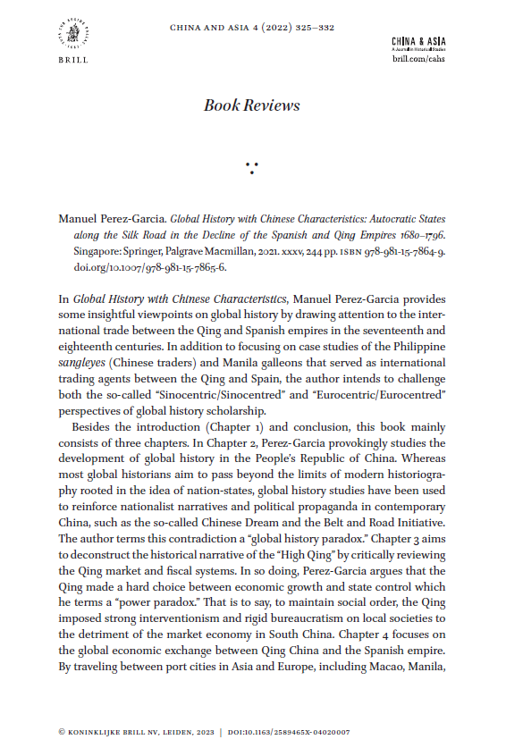 [Book Reviews] Manuel Perez-Garcia. Global History with Chinese Characteristics: Autocratic States along with Silk Road in the Decline of the Spanish and Qing Empire 發佈留言 / Book Reviews, Research / [email protected] Aug 20 Ling-Wei Kung, 2023.1,“[Book Reviews] Manuel Per [Book Reviews] Manuel Perez-Garcia. Global History with Chinese Characteristics: Autocratic States along with Silk Road in the Decline of the Spanish and Qing Empire 閱讀全文 »
